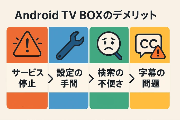 高価な製品では、有料のビデオオンデマンド(VOD)サービスを無料で視聴できる場合もありますが、著作権やセキュリティ上のリスク、サービスが停止する可能性といったデメリットも無視できません。