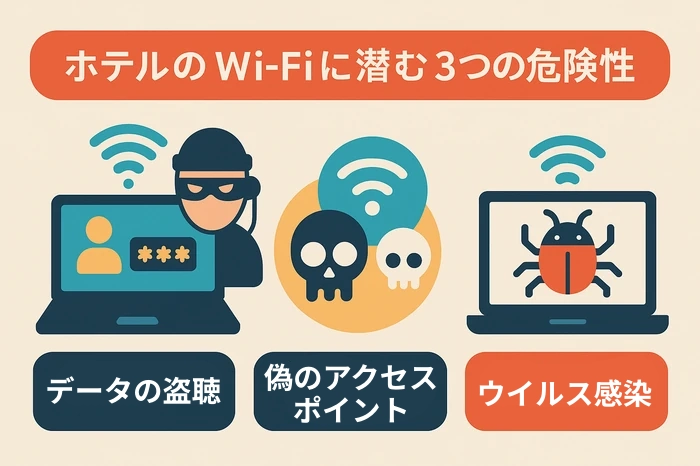 ここでは、ホテルのWi-Fiを利用する際に注意すべき 3つの危険性をわかりやすく解説していきます。