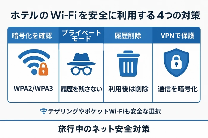 - 安全対策:VPN利用・重要情報を入力しない・暗号化方式を確認・テザリングやポケットWi-Fi活用