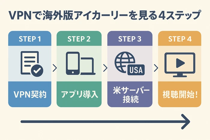 VPNを使って海外版アイカーリーを視聴する4ステップ