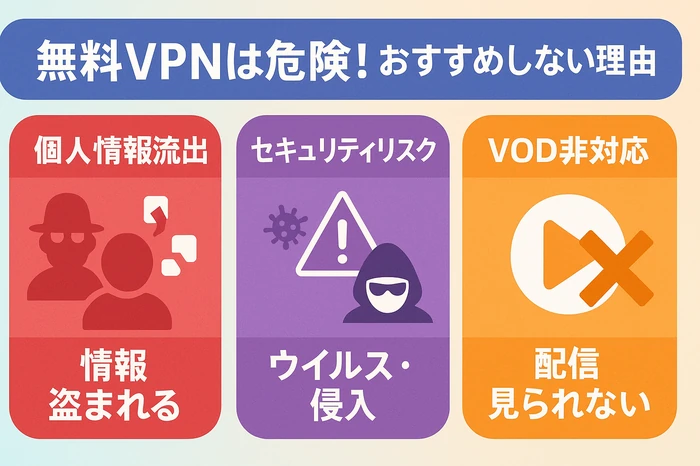 「お金をかけずに使えるならラッキー!」と思いがちですが、無料VPNは危険が多いため基本的におすすめできません。